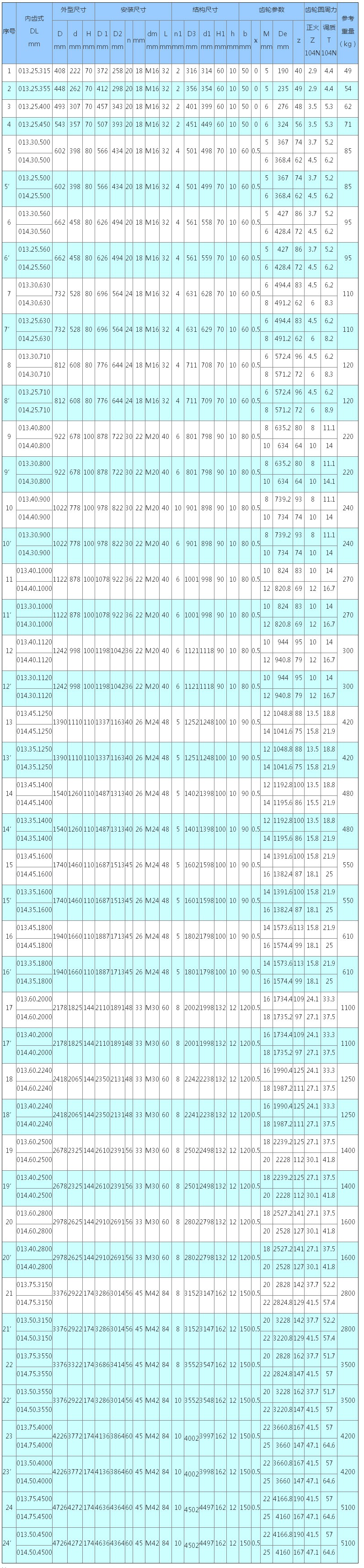 注: 1、n1為潤滑油孔數,均布:油杯M10×1 JB/T7940.1-JB/T7940.2 2、安裝孔n-dn1、n-dn2可改用螺孔;齒寬b可改為H-h。 3、表內齒輪圓周力為最大圓周力,額定圓周力取其1/2。 4、內齒修頂系數為0.2。